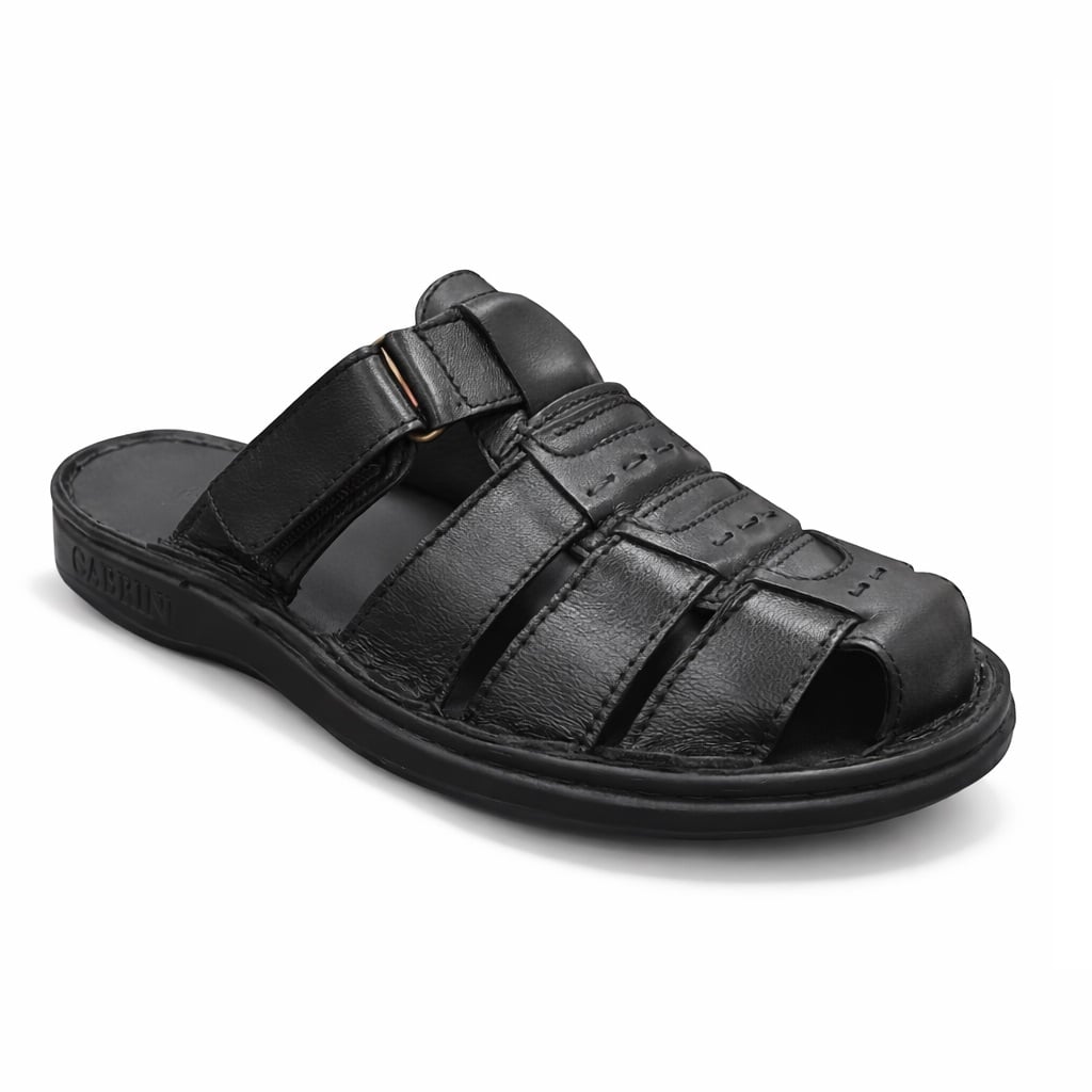 Cabrini ανδρική παντόφλα  με σκρατς στο πλάι για καλύτερη εφαρμογή σε μαύρο χρώμα. Δερμάτινη, με δερμάτινη φόδρα και δερμάτινο πατάκι. Σόλα ελαφριά ανατομική και αντιολισθητική. Για πολύ άνετο βάδισμα.