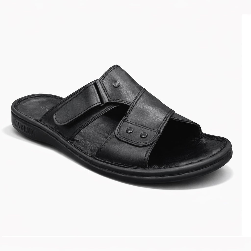 Cabrini ανδρική παντόφλα  με σκρατς στο πλάι για καλύτερη εφαρμογή σε μαύρο χρώμα. Δερμάτινη, με δερμάτινη φόδρα και δερμάτινο πατάκι. Σόλα ελαφριά ανατομική και αντιολισθητική. Για πολύ άνετο βάδισμα.
