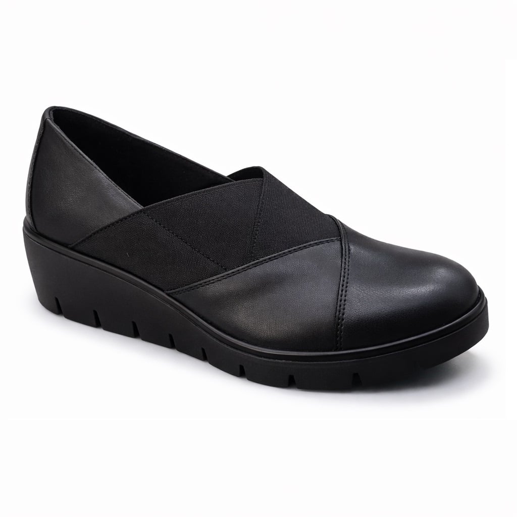 Imac γυναικεία πλατφόρμα σε μαύρο χρώμα με λάστιχα στο κουντεπιέ για καλύτερη εφαρμογή στο πόδι. Δερμάτινη εξωτερικά με φόδρα micro fibra αντιιδρωτική. Σόλα ανατομική, ελαφριά για πολύ μαλακό και άνετο βάδισμα. Ύψος σόλας 5cm.
