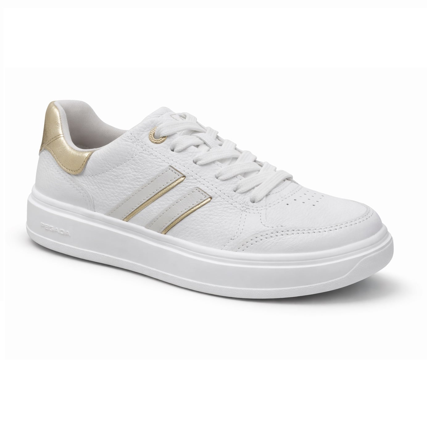 Pegada γυναικείο sneaker με κορδόνι για να εφαρμόζει στο πόδι σε λευκό χρώμα. Δερμάτινο με αντιιδρωτική φόδρα και μαλακό, αφρώδες πατάκι. Σόλα ανατομική λαστιχένια και αντιολισθητική. Ύψος σόλας 4 cm.