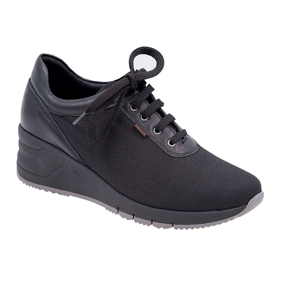 Ragazza γυναικείο sneaker με κορδόνι σε χρώμα μαύρο. Από αδιάβροχο οικολογικό υλικό εξωτερικά, αντιιδρωτική υφασμάτινη φόδρα και αντιιδρωτικό πατάκι. Σόλα ανατομική λαστιχένια και αντιολισθητική. Ύψος σόλας 4,5cm