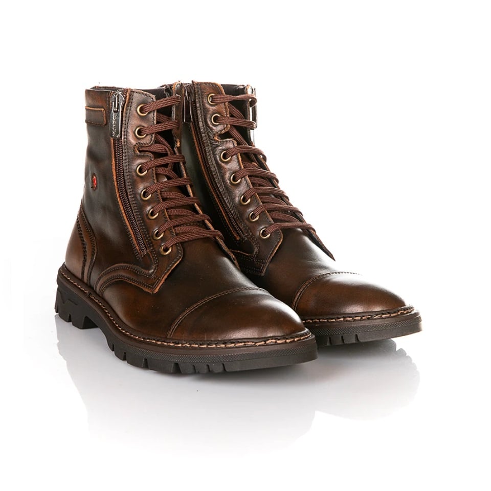 Robinson ανδρικό μποτάκι με κορδόνι και φερμουάρ σε καφέ χρώμα. Δερμάτινο, με ζεστή υφασμάτινη φόδρα και μαλακό πατάκι. Σόλα λαστιχένια, με τακούνι, ανατομική και αντιολισθητική.