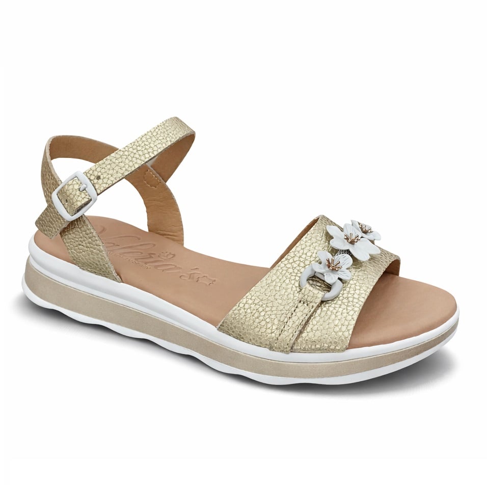Valeria’s γυναικείο πέδιλο καθημερινό αλλά και για καλό ντύσιμο σε χρυσό χρώμα. Δερμάτινο με δερμάτινη φόδρα και δερμάτινο πατάκι. Σόλα ελαφριά ανατομική και αντιολισθητική. Ύψος σόλας 3cm.